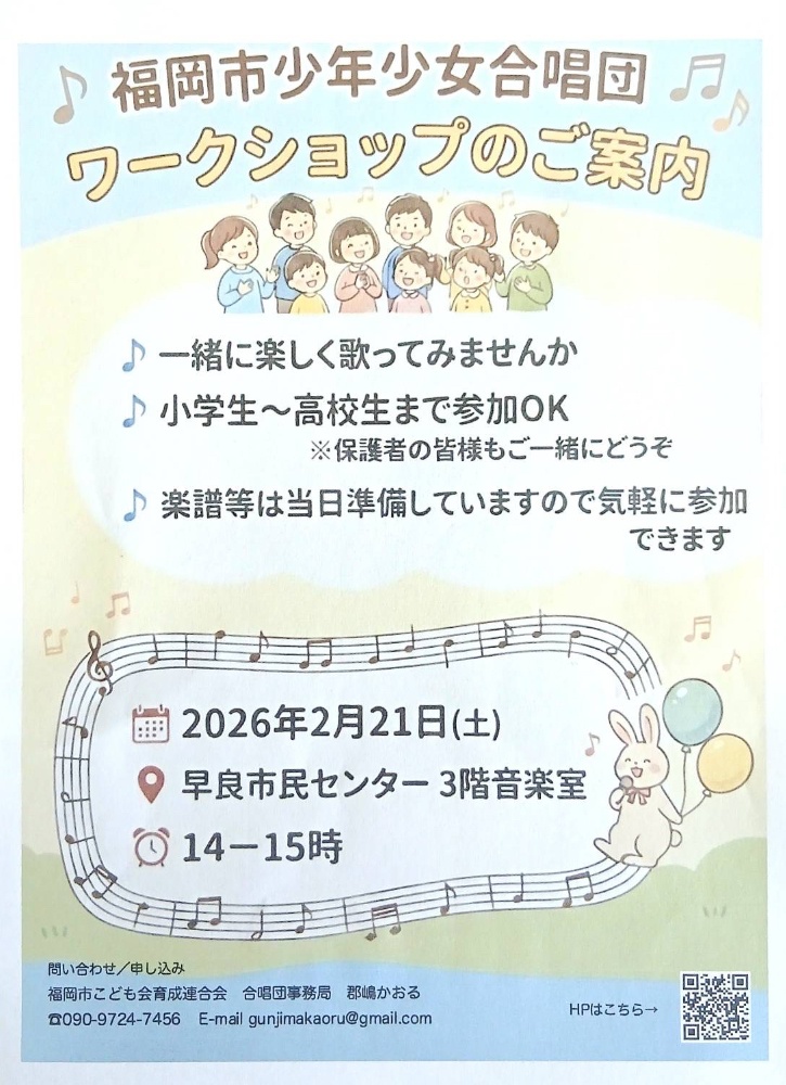 私たち福岡市少年少女合唱団は、市内のいろいろな学校から集まった歌の大好きな小学生〜高校生が毎週楽しく活動しています♪